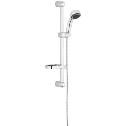 Die Brausestangengarnitur besteht aus einer 60 cm langen Brausestange (Ă 25 mm) mit Seifenschale, einer verchromten Multifunktions-Handbrause mit 5 Funktionen und einem Brauseschlauch aus Metall in 150 cm LĂ€nge. ZusĂ€tzlich verhindern die praktischen Anti-Kalknoppen effektiv lĂ€stige Ablagerungen. Die Garnitur ist passend fĂŒr AnschlĂŒsse mit 18,6 mm (G 1/2). Im Lieferumfang ist das Befestigungsmaterial enthalten.