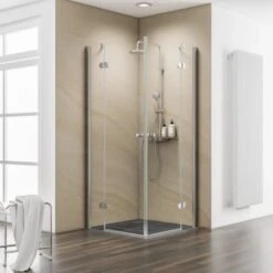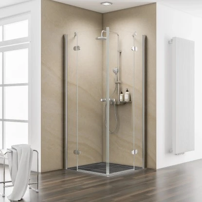 Der Eckeinstieg besteht aus 6 mm Echtglas. Durch die werkseitig aufgetragene fixil-Beschichtung wird die Reinigung der Dusche vereinfacht: Das Wasser zieht sich in dicken Tropfen zusammen und flieĂt mit Kalk- und SchmutzrĂŒckstĂ€nden einfach ab. fixil-Glassiegel wird in einem aufwendigen Verfahren werkseitig auf der dem Wasser ausgesetzten Seite Ihrer Dusche aufgetragen.