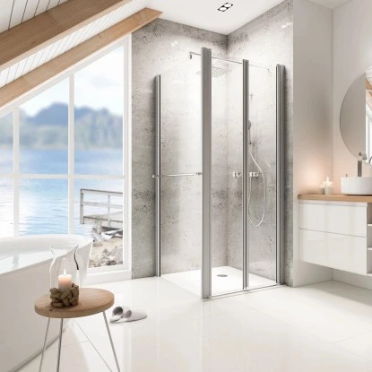 Die Schulte Duschkabine mit Pendeltür Garant besteht aus insgesamt drei 6 mm starken Elementen aus Sicherheitsglas (ESG), welche von eleganten Profilen teilgerahmt sind. Die hochwertigen Profile aus Aluminium und die handlichen Knopfgriffe verleihen dem Artikel einen modernen Look, der jedes Bad bereichert.